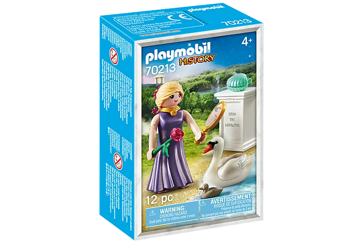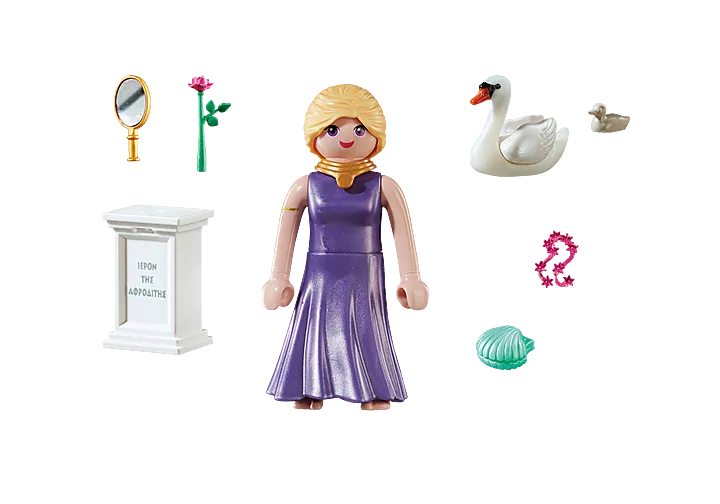 De set bevat de godin Aphrodite met een gouden spiegel, een roos en een zwaan, een zuil met een inscriptie en een schelp.